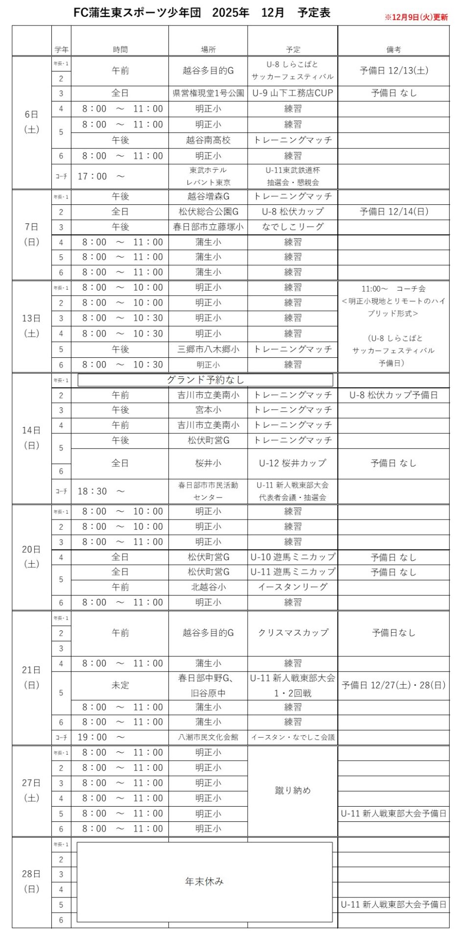 12月の活動予定(練習時間・場所や大会・試合の予定)は以下の通りですので、どうぞご確認ください。